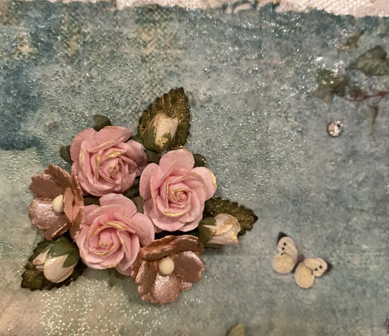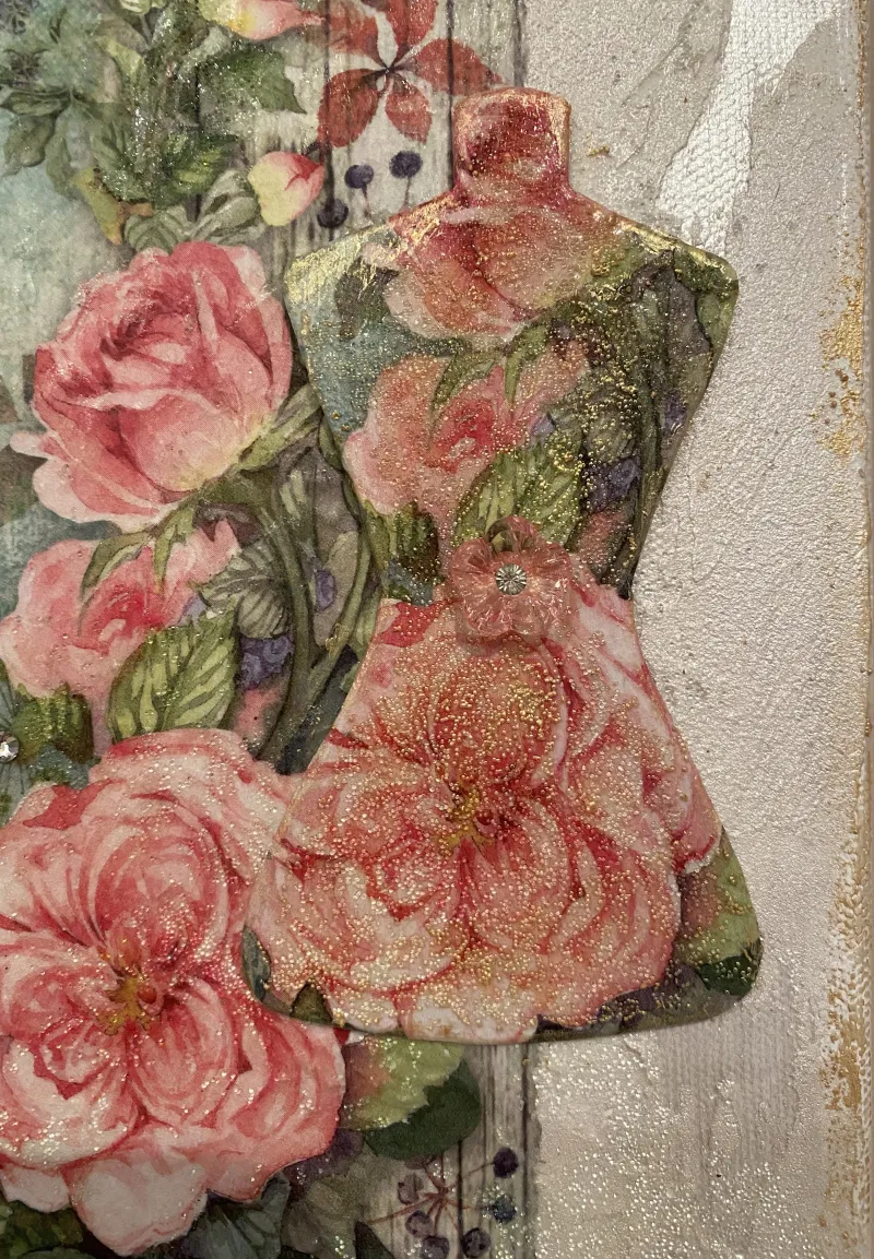 Butterflies & Roses was so gorgeous to do on this 25x30cm canvas. This art creation uses mixed media techniques using artist quality products - acrylic paint, texture paste, glass bead gel, rice paper and a dressform. Embellished with hand-painted paper roses, rosebuds and leaves, plus a vintage button and swarovski crystals.